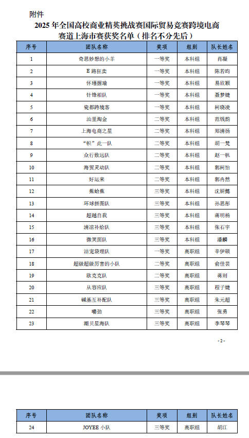 近日,2025年全国高校商业精英挑战赛国际贸易竞赛跨境电商赛道上海市赛圆满落幕。我院共34名学生参赛,凭借扎实的专业知识、出色的团队协作与创新实践能力,在激烈角逐中脱颖而出,共斩获一等奖1项、二等奖1项、三等奖3项的优异成绩,展现了学校在跨境电商人才培养方面的扎实基础和卓越成果。