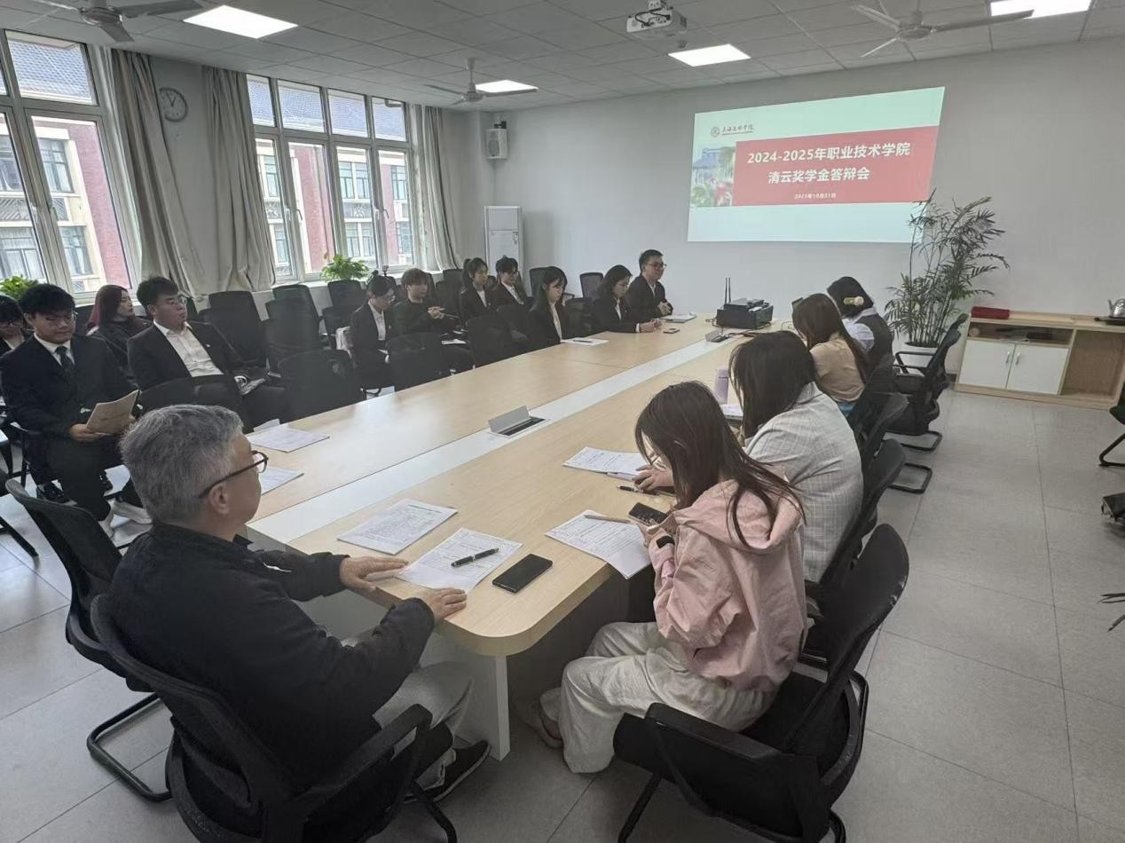 10月21日下午13:00,职业技术学院召开2024-2025学年“清云奖学金”答辩会,院党委书记王加宁、副书记马冯莉,24级辅导员庞雪雅、王习力、涂红,23级辅导员裴瑞华、刘玲玲以及奖助负责人徐展飞,作为学生评优工作小组成员出席答辩会。