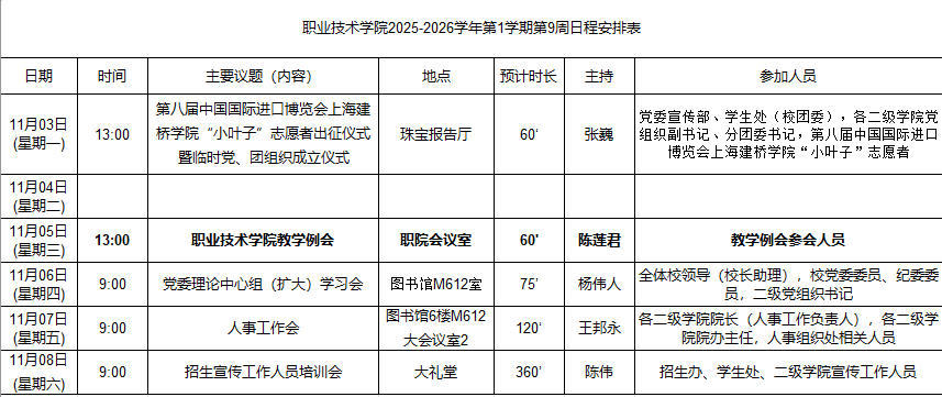 职业技术学院2025-2026学年第1学期第9周日程安排表