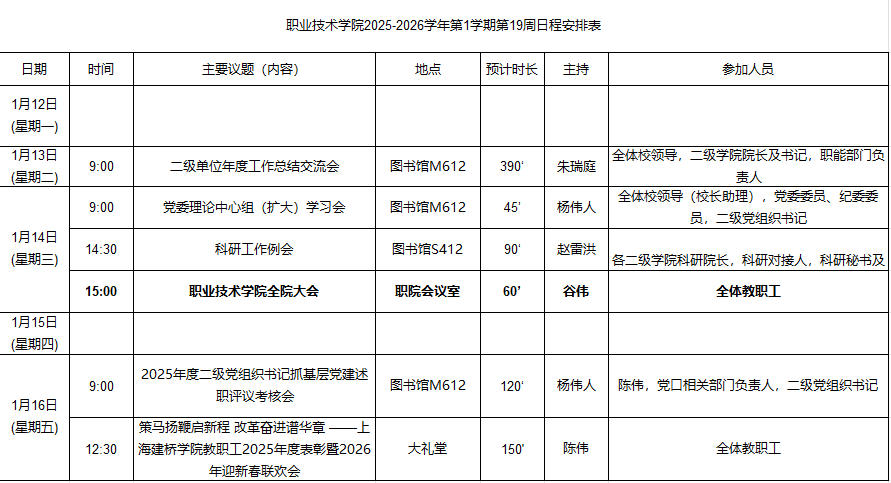 职业技术学院2025-2026学年第1学期第19周日程安排表