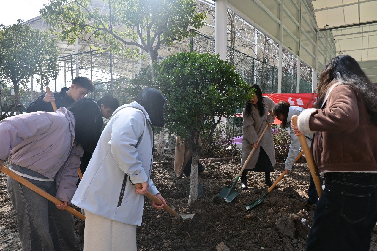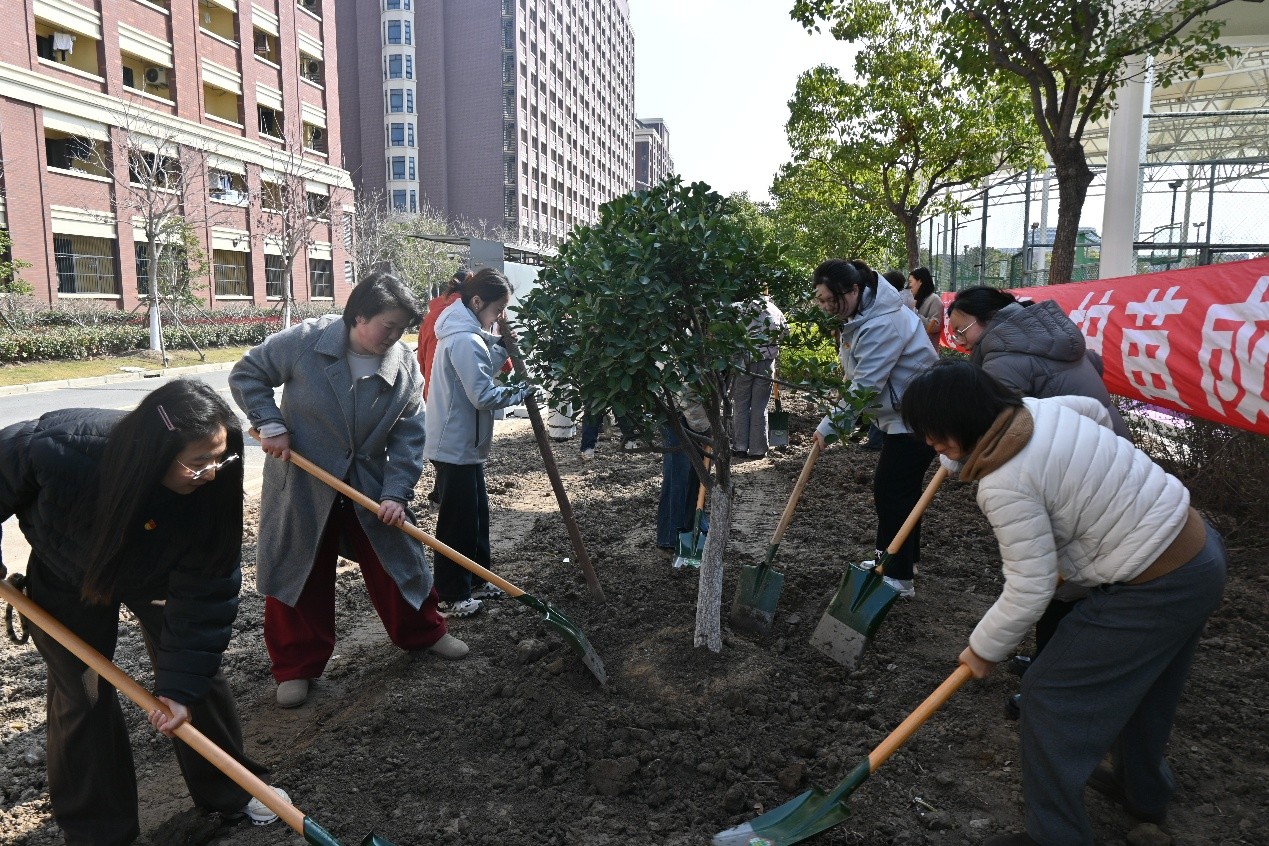 随后,在工作人员的示范下,各党支部师生党员代表精神饱满、热情高涨,迅速投入到植树劳动中。大家分工协作、默契配合,挥锹铲土、扶苗定位、培土压实,每一个环节都一丝不苟、井然有序。经过一番忙碌,一株株树苗稳稳扎根、昂然挺立,为春日校园注入了蓬勃生机,也寄托了大家守护生态环境的美好愿景。
