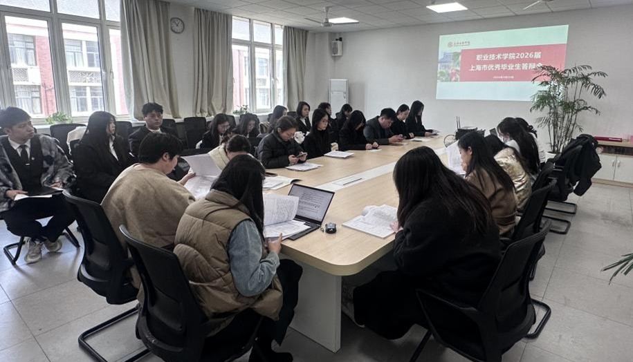 为选拔表彰优秀毕业生,展现学院学子风采,激励全院学生奋发向上,3月25日下午13:00,职业技术学院召开2026届“上海市普通高等学校优秀毕业生”答辩会,院党委书记党松杰、副书记马冯莉以及全体辅导员作为学生评优工作小组成员出席答辩会。