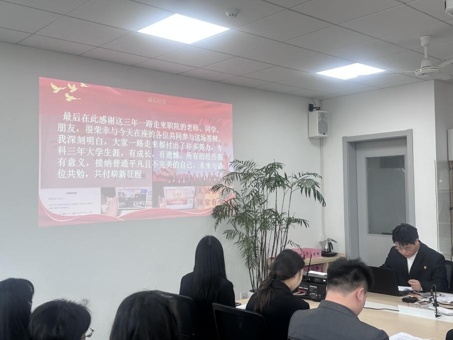 随后,党委书记党松杰作总结讲话。她用“真实、成长、优秀”六个字高度概括了聆听本次学生答辩后的整体感受,向顺利完成答辩的全体同学表示祝贺,肯定大家展现出的职院学子良好风貌,称赞同学们思路清晰、态度真诚,完全配得上优秀毕业生这一荣誉称号。围绕学子们的答辩表现,党书记从三个方面给予高度评价:一是有态度,同学们全面复盘大学三年成长历程,尽显认真上进的优良学风,清晰诠释了“专科起点不能决定人生终点”的奋斗内涵;二是有本领,无论是学业成绩、科创竞赛,还是社会实践、志愿服务,同学们都各有所长、亮点纷呈,真正做到了学有所长、技有所精;三是有温度,全体同学皆心怀感恩,感念学校与老师的培育之恩,生动践行了学校“感恩、回报、爱心、责任”的八字校训。