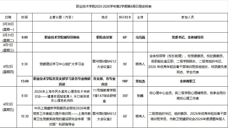 职业技术学院2025-2026学年第2学期第4周日程安排表